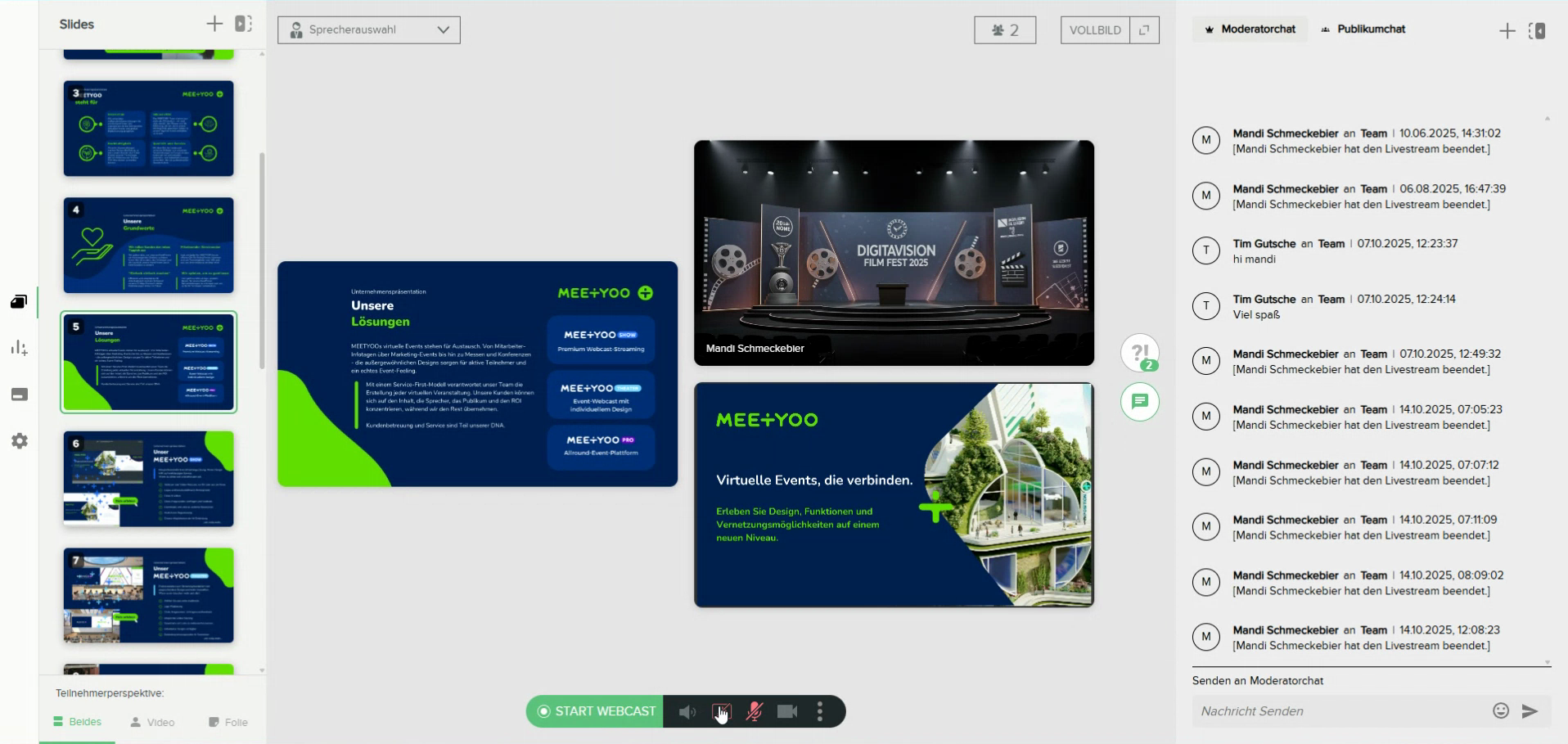 During your live webcast, you can flexibly switch between different perspectives for your audience. You control these views easily in the lower control area of your webcast environment.